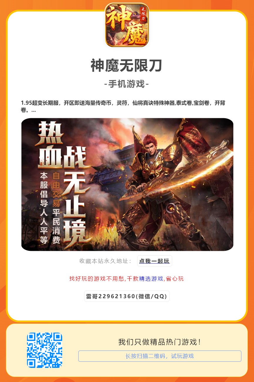 1.95超变长期服,开区即送海量传奇币,灵符,仙将真诀特殊神器,泰式卷,宝剑卷,开背卷。每日刷怪打累充红包,所有材料都可以爆,拒绝无脑挂机,超高爆率,超炫技能,超级BUFF。重燃传奇,战斗无止境!