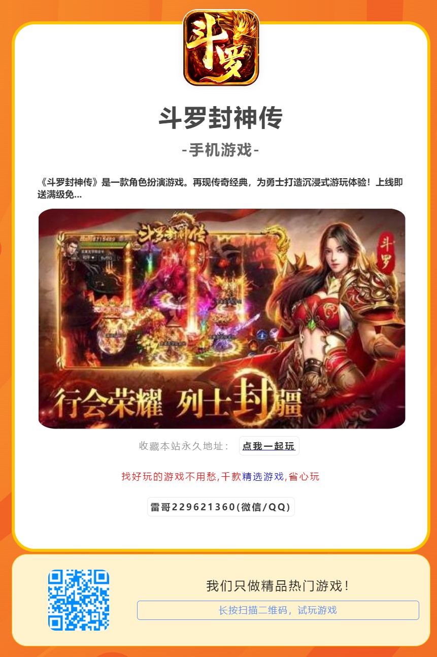 《斗罗封神传》是一款角色扮演游戏。再现传奇经典,为勇士打造沉浸式游玩体验!上线即送满级免费特权,2000元特权卡免费送,无限畅领免费红包,不充也能当大哥!道法战三职自由选择,个性时装幻武随心切换,塑造专属形象!经典副本黄巾营地、青州城等任你体验,神级装备挂机即可获取,助你轻松登称霸天下!快召集好兄弟,重游乱世,续写你的传奇!