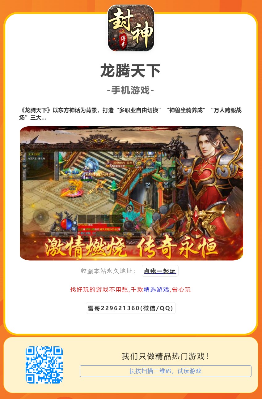《龙腾天下》以东方神话为背景,打造“多职业自由切换”“神兽坐骑养成”“万人跨服战场”三大核心玩法。游戏包含九大职业(剑仙、天师、巫祝、修罗等),独创“龙魂觉醒”“五行灵脉”“神兵谱”系统。新服登录即送SSR神兽“青龙·震天雷”及绑定元宝*18888,通过“龙渊秘境”与“跨服押镖”玩法可2小时解锁觉醒技“龙啸九天”,5天激活全屏奥义“万剑归宗”。游戏内开放十大核心玩法(灵宠合体、神装锻造、跨服攻城、五行试炼、龙脉争夺),所有装备材料均支持自由交易,平民玩家通过“龙魂拍卖行”实现战力反超。