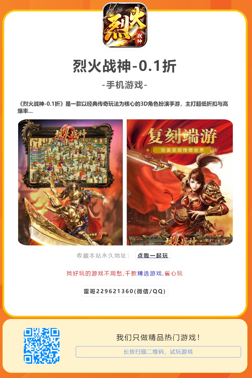 《烈火战神-0.1折》是一款以经典传奇玩法为核心的3D角色扮演手游,主打超低折扣与高爆率特色。游戏继承传奇IP的经典设定,同时加入全新剧情与创新系统,玩家可通过0.1折充值轻松获取顶级装备与稀有道具,适合追求高性价比的平民玩家。以下从游戏特色与核心玩法展开介绍。