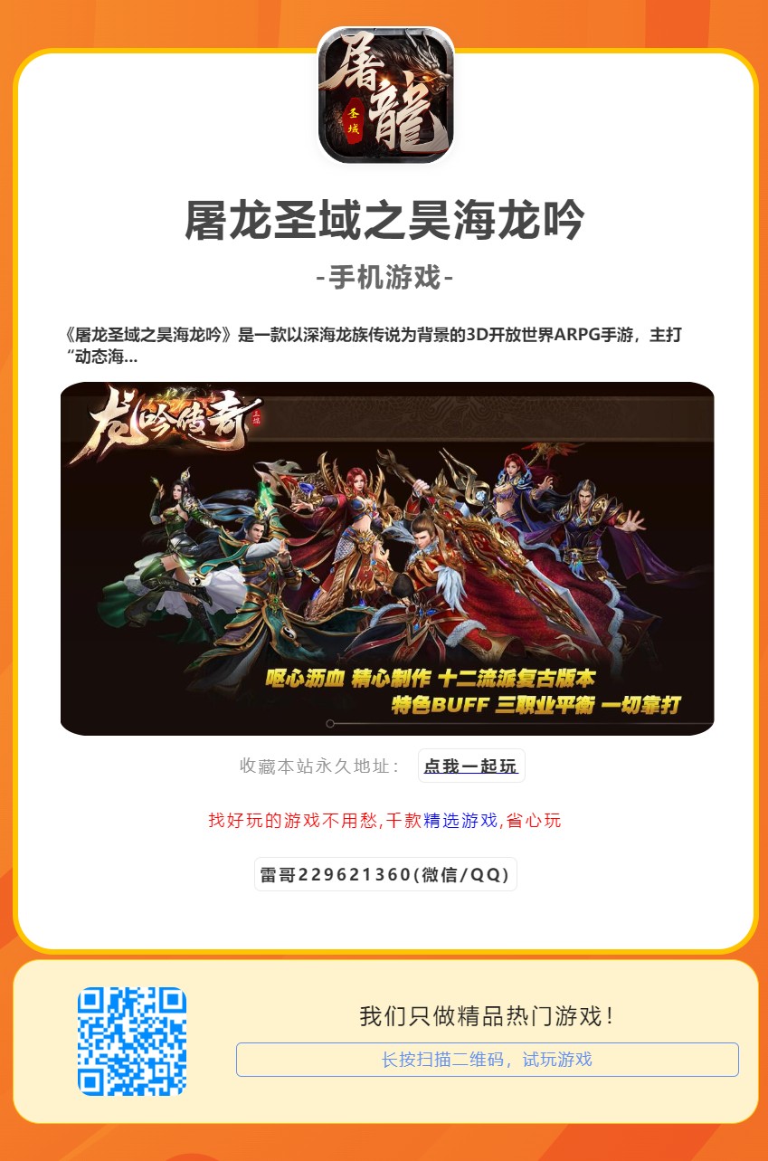 《屠龙圣域之昊海龙吟》是一款以深海龙族传说为背景的3D开放世界ARPG手游,主打“动态海域探索”与“龙魂契约”养成体系。游戏打破传统屠龙题材框架,融入潮汐变化、深海遗迹解谜等创新玩法,支持跨服组队狩猎上古龙兽,零氪玩家通过策略搭配亦可逆袭成顶级驭龙者。以下从特色解析到实战技巧全面拆解。