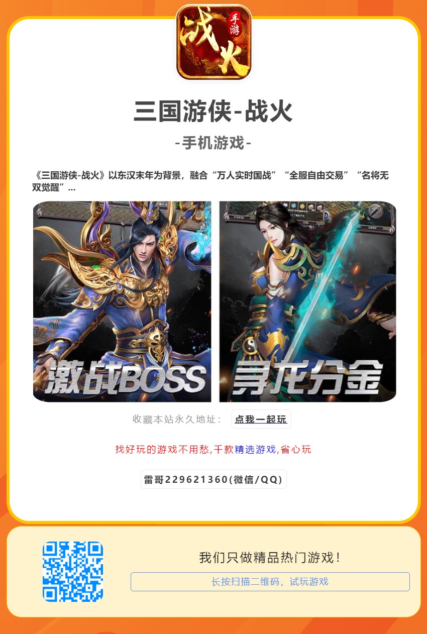 《三国游侠-战火》以东汉末年为背景,融合“万人实时国战”“全服自由交易”“名将无双觉醒”三大核心玩法。游戏收录超200名三国名将(如吕布、诸葛亮、赵云、周瑜),独创“兵种克制”“城池争夺”“计策连携”系统。新服登录即送SSR武将“吕布·鬼神降世”及元宝*18888,通过“剿匪挂机”“赤壁之战”副本可1小时激活觉醒技“无双乱舞”,3天解锁全屏奥义“烽火燎原”。游戏内开放十大核心玩法(跨服国战、武将羁绊、兵营养成、联盟争霸、史诗战役),所有装备与武将碎片均可自由交易,零氪玩家可通过“黑市拍卖”快速积累资源。