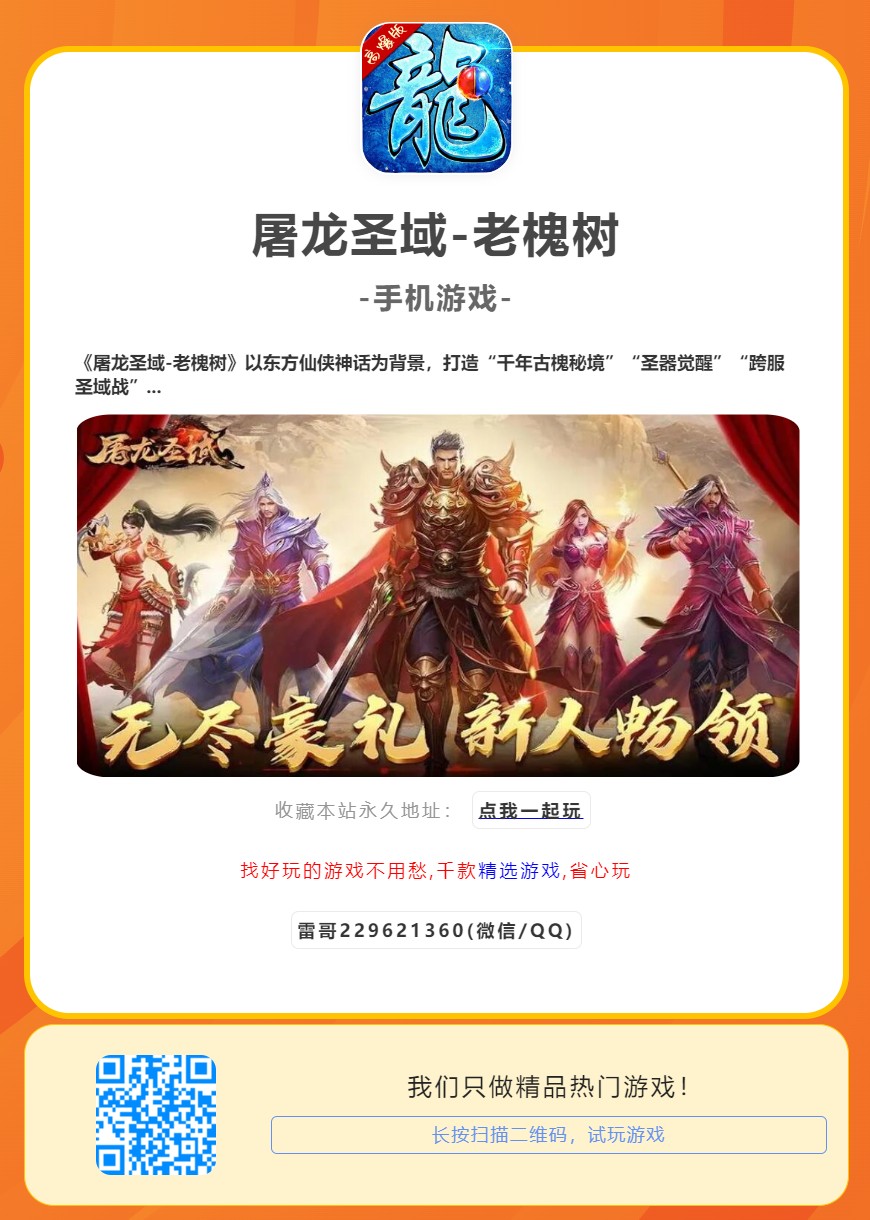 《屠龙圣域-老槐树》以东方仙侠神话为背景,打造“千年古槐秘境”“圣器觉醒”“跨服圣域战”三大核心玩法。游戏独创“四象职业”(剑仙、巫祝、妖灵、武尊),支持双形态自由切换与技能融合。新服登录即送SSS级圣器“槐神古剑”及灵石*28888,通过“古槐挂机”“圣域试炼”可1小时激活觉醒技“万木逢春”,3天解锁全屏奥义“圣域天罚”。游戏内开放九大核心玩法(圣域战场、古槐秘境、灵兽化形、仙盟争霸、全服拍卖行),所有装备均无绑定限制,零氪玩家可通过交易行倒卖稀有材料实现战力飞升。