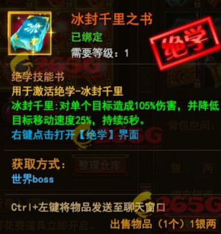 冰封千里需要5本冰封千里之书激活,冰封千里之书通过世界BOSS掉落,不要觉得自己抢不到BOSS就不去打了,只要打了世界BOSS就会有奖励!就有概率获得冰封千里之书!