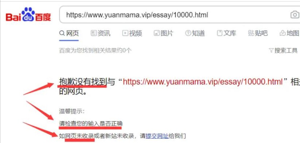 网址3的搜索结果,从搜索结果我们可以看出,该网址也没有被百度收录,且搜索结果中出现了“抱歉没有找到”,“请检查您的输入是否正确”,“网页未收录”等关键字。