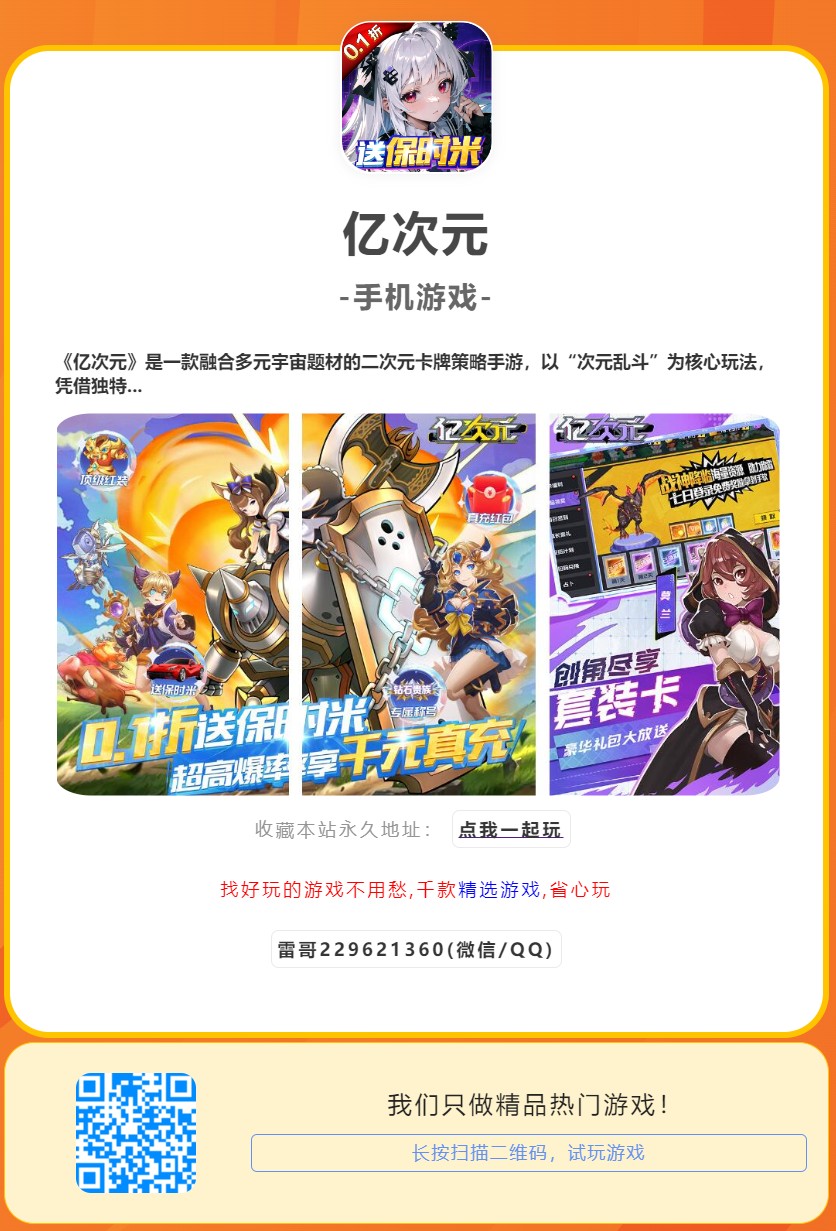 《亿次元》是一款融合多元宇宙题材的二次元卡牌策略手游,以“次元乱斗”为核心玩法,凭借独特的3D角色建模、动态剧情分支及跨次元角色联动,迅速成为热门IP。玩家可通过召唤来自不同时空的英雄,组建强力阵容,挑战次元裂隙、阵营战等多样玩法,体验打破维度界限的沉浸式冒险。
