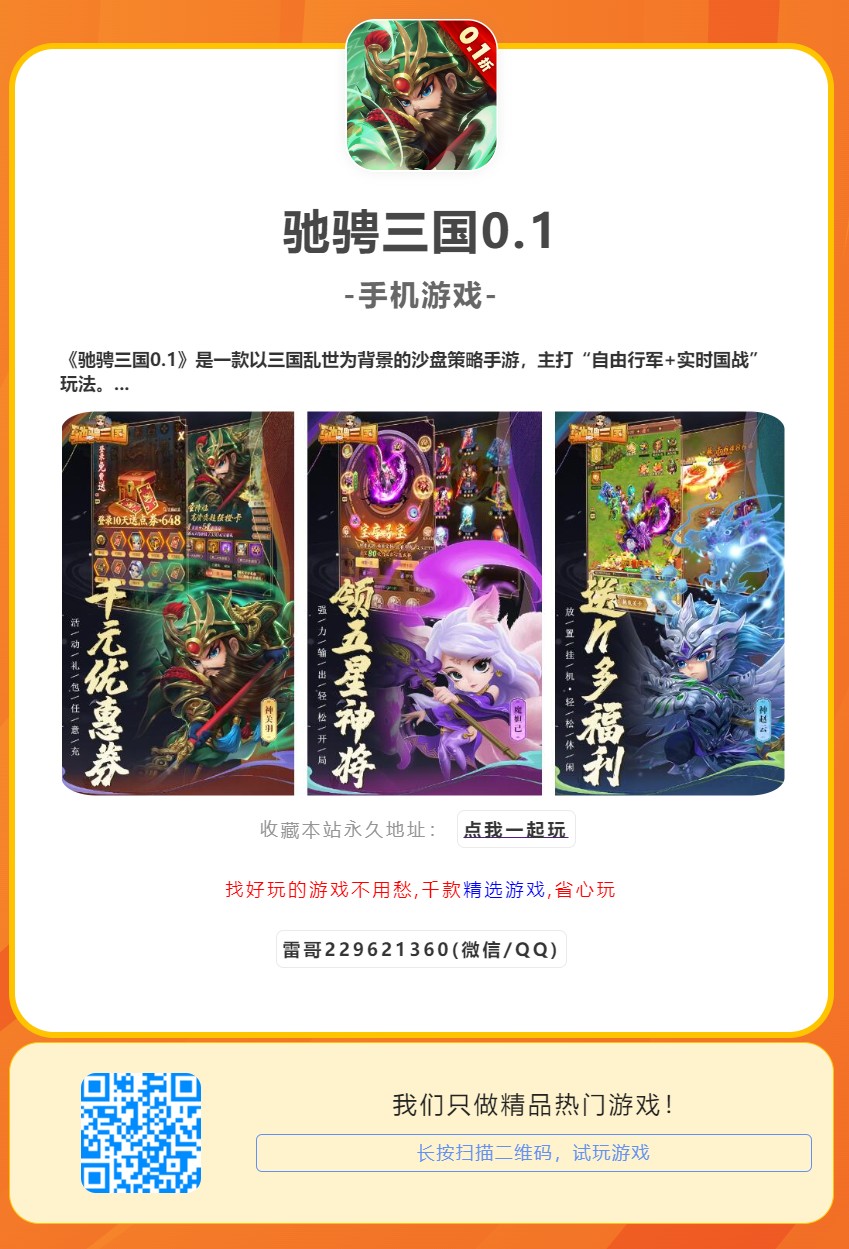 《驰骋三国0.1》是一款以三国乱世为背景的沙盘策略手游,主打“自由行军+实时国战”玩法。游戏通过高度还原历史名将、独创兵种克制系统及跨服联盟争夺战,打造沉浸式三国争霸体验。玩家可扮演一方诸侯,招募名将、发展城池、合纵连横,最终问鼎中原。