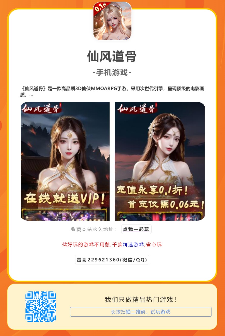 《仙风道骨》是一款高品质3D仙侠MMOARPG手游。采用次世代引擎,呈现顶级的电影画质,让玩家置身于一个真实的仙侠世界。在这里,你可以自由探索独特的炼化系统,通过自由组合配方,打造出独一无二的神兵利器。游戏社交玩法丰富,让你在修仙之路不再孤单。更有海量时装和坐骑,让你打造个性化的角色。在线即送VIP15和海量仙玉,尽享尊贵特权。别错过《仙风道骨》,开启一段情感与战斗交织的仙侠之旅!