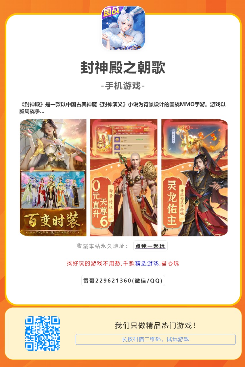 《封神殿》是一款以中国古典神魔《封神演义》小说为背景设计的国战MMO手游。游戏以殷周战争、阐截斗法为剧情主线,首先讲述由玩家扮演的传奇英雄救玉虚宫于危难,后受元始天尊点化,与阐教仙人合力助周,同哪吒、杨戬、雷震子等神话人物并肩作战,一路降妖除魔,进兵朝歌,最终还天下以太平的奇幻战争故事。