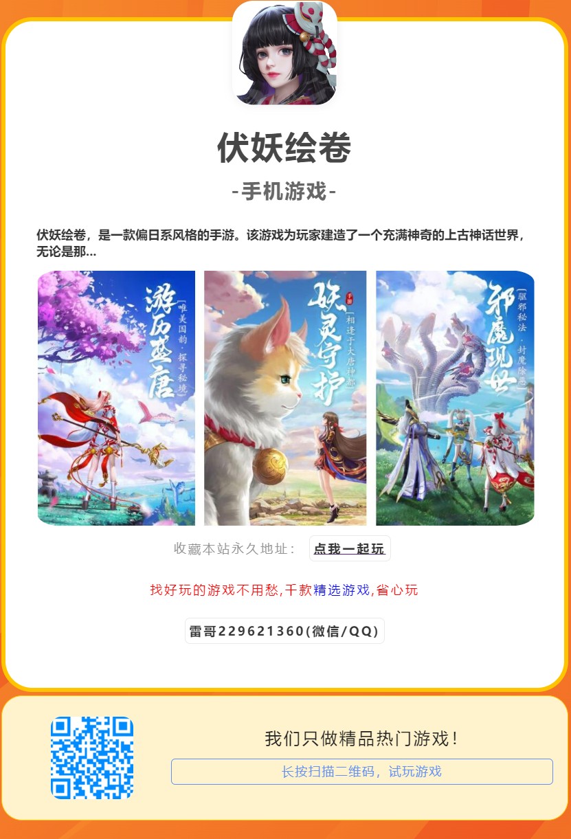 伏妖绘卷,是一款偏日系风格的手游。该游戏为玩家建造了一个充满神奇的上古神话世界,无论是那些蛮荒凶兽还是上古大神,都可以在游戏中遭遇到。给玩家还原了一个真实的山海经里的上古世界,让每一位玩家都能在游戏中尽情的体验东方上古神话的魅力,以中国古代修仙故事为背景的ARPG修仙类游戏,在流畅爽快的战斗基础上,还加入了收集强力装备、进阶、学习技能、开启功能、获得绝世法宝等修仙风味浓厚又极具特色的玩法,最重要的是VIP可以通过完成关卡+消耗元宝获得,VIP免费拿全程不花钱!