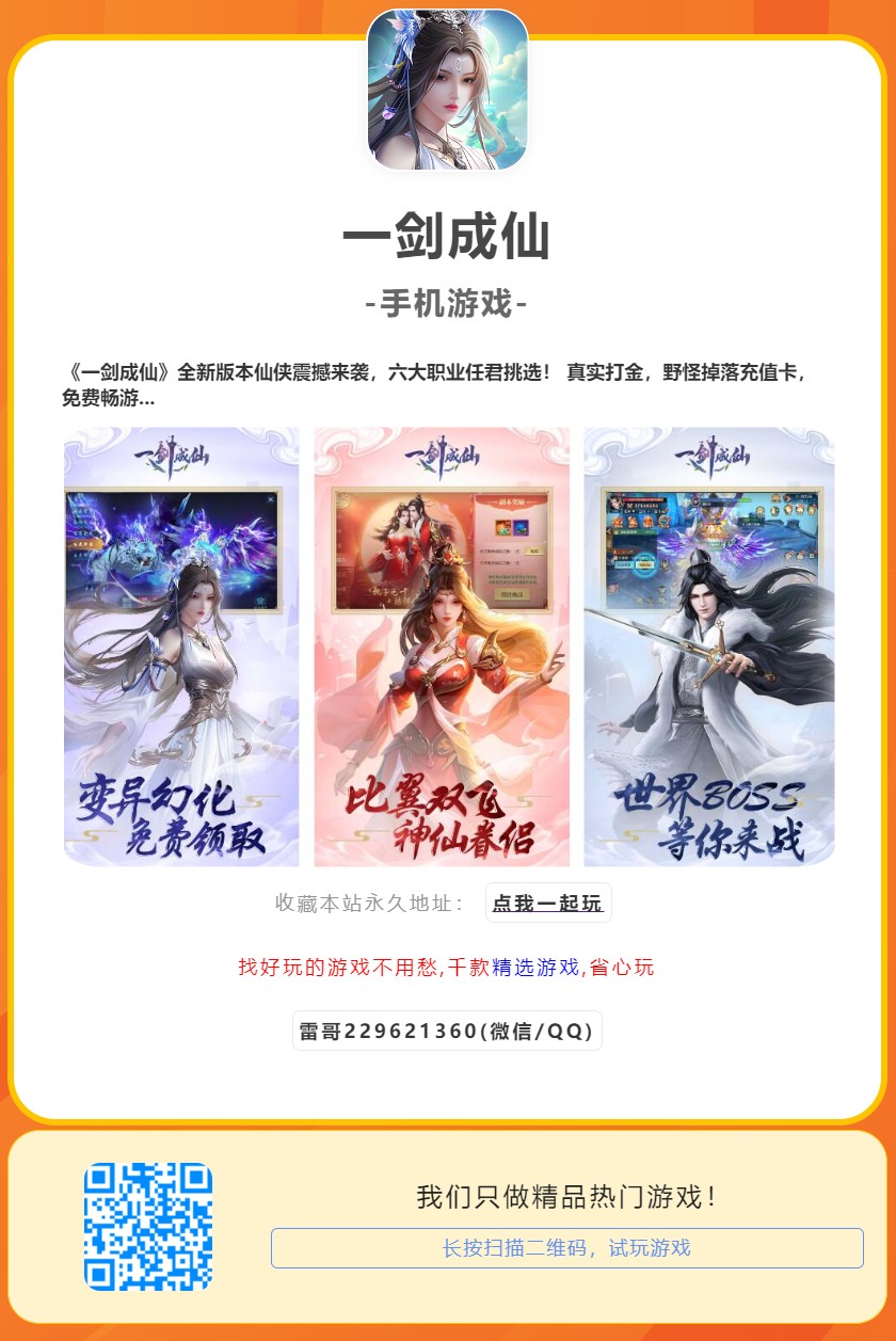 《一剑成仙》全新版本仙侠震撼来袭,六大职业任君挑选! 真实打金,野怪掉落充值卡,免费畅游仙侠世界! 上线即可领取全套霸气时装,海量元宝,多种材料通通免费送! 线下自选商城,稀有道具,炫酷外显应有尽有!