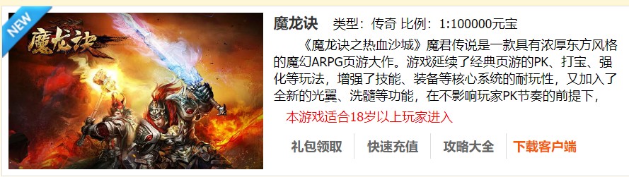 《魔龙诀之热血沙城》魔君传说是一款具有浓厚东方风格的魔幻ARPG页游大作。游戏延续了经典页游的PK、打宝、强化等玩法,增强了技能、装备等核心系统的耐玩性,又加入了全新的光翼、洗髓等功能,在不影响玩家PK节奏的前提下,全方位提升游戏的畅快感。