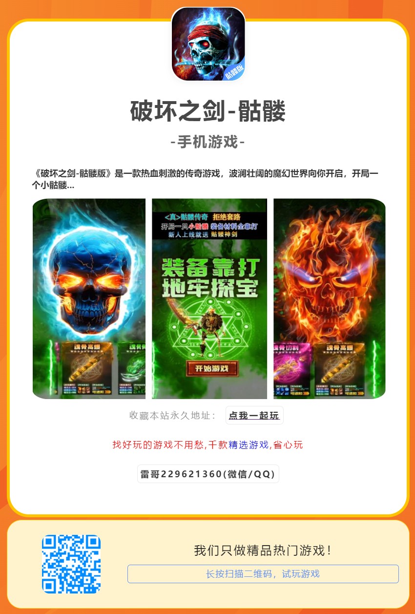 《破坏之剑-骷髅版》是一款热血刺激的传奇游戏,波澜壮阔的魔幻世界向你开启,开局一个小骷髅你可操控角色在地图上的各个地方冒险,更多炫酷武器装备以及精美造型任你变换,提高角色的属性和战斗力,在魔幻大陆上的各个地方探索,支持多人在线竞技,简单方便!