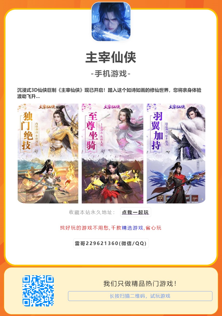 沉浸式3D仙侠巨制《主宰仙侠》现已开启!踏入这个如诗如画的修仙世界,您将亲身体验渡劫飞升的紧张刺激、驾驭飞剑的自由畅快、召唤法宝的无穷力量以及与仙灵并肩作战的深厚友情。更有海量PVE内容等待挑战,一切精彩,尽在《主宰仙侠》,即刻启程,开启您的修仙之旅!