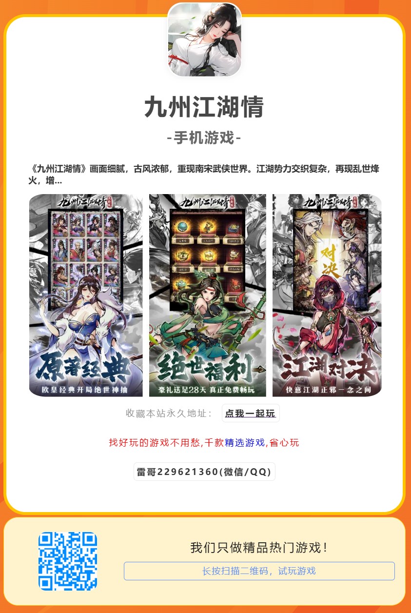 《九州江湖情》画面细腻,古风浓郁,重现南宋武侠世界。江湖势力交织复杂,再现乱世烽火,增添游戏厚重感,多重剧情分支选择,决定江湖命运,打造独特个人传奇,细节打磨用心,背景音乐动人,全方位营造真实江湖氛围。