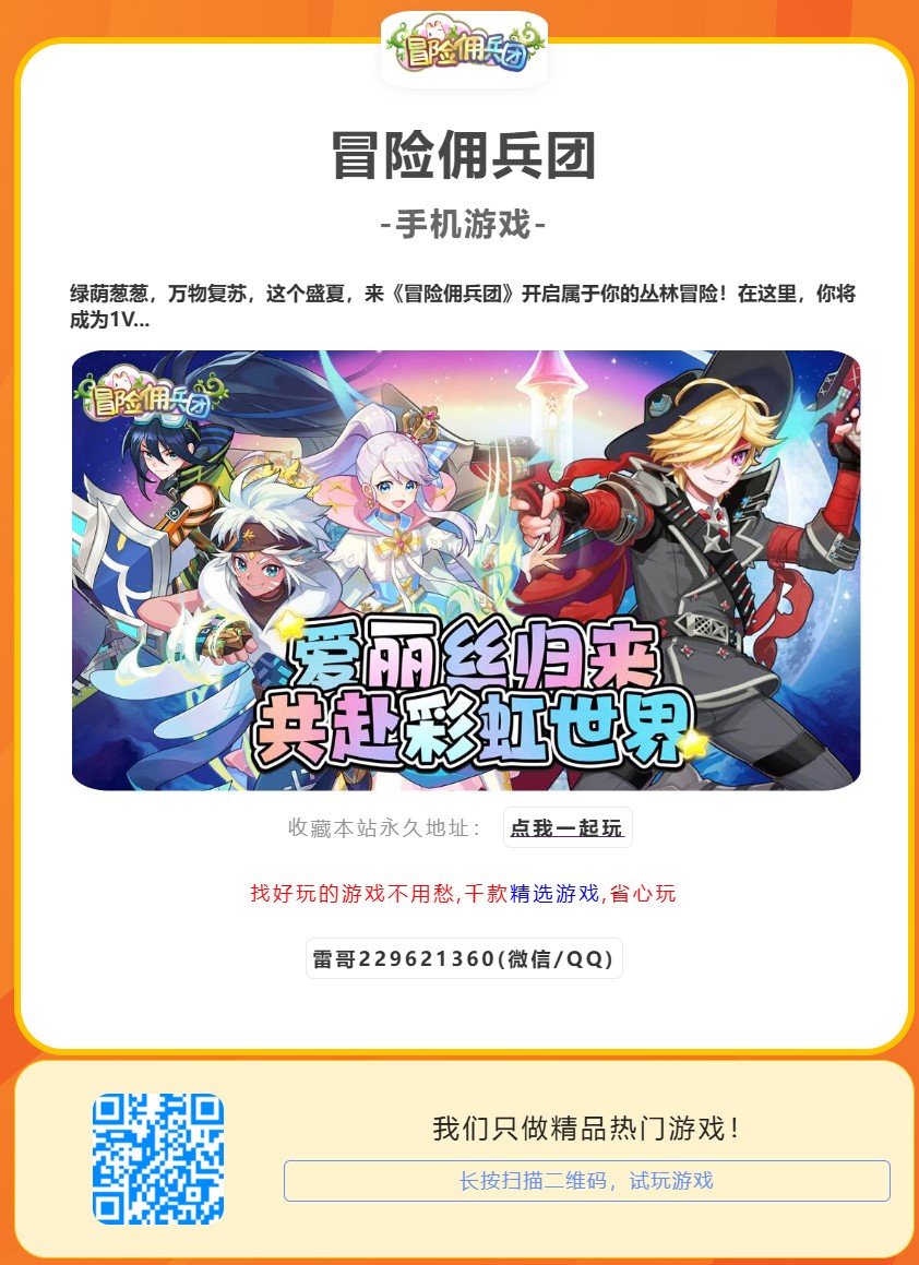 绿荫葱葱,万物复苏,这个盛夏,来《冒险佣兵团》开启属于你的丛林冒险!在这里,你将成为1V100的存在,一人一箭勇闯关卡。关卡中你会遇到各种BOOS的袭击,飞天小鬼、隐身小怪、以及自带技能的大boos,要想成功过关斩将,需要凭借你过人的灵活走位、极限手速技巧,来打败各种怪物和boss,每过一个关卡都有额外奖励和特殊技能加持。勇士们!快来用你的计谋和走位,击败可恶的怪物,决一死战吧!我在勇者大陆等你!