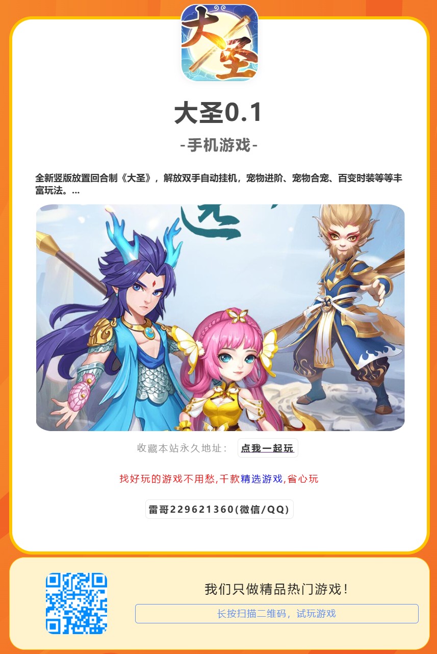 全新竖版放置回合制《大圣》,解放双手自动挂机,宠物进阶、宠物合宠、百变时装等等丰富玩法。酷炫的坐骑、翅膀、精灵和龙魂,将拉风进行到底!