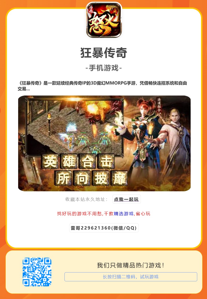 《狂暴传奇》是一款延续经典传奇IP的3D魔幻MMORPG手游,凭借畅快连招系统和自由交易玩法吸引大量玩家。本文详细解析游戏特色、职业选择技巧以及装备养成攻略,助你快速提升战力。