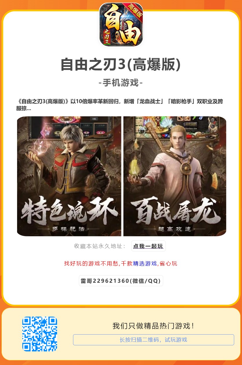 《自由之刃3(高爆版)》以10倍爆率革新回归,新增「龙血战士」「暗影枪手」双职业及跨服掠夺玩法。本文深度解析装备爆率地图、技能连招公式、赛季通行证冲刺技巧,助你快速集齐神装制霸全服。