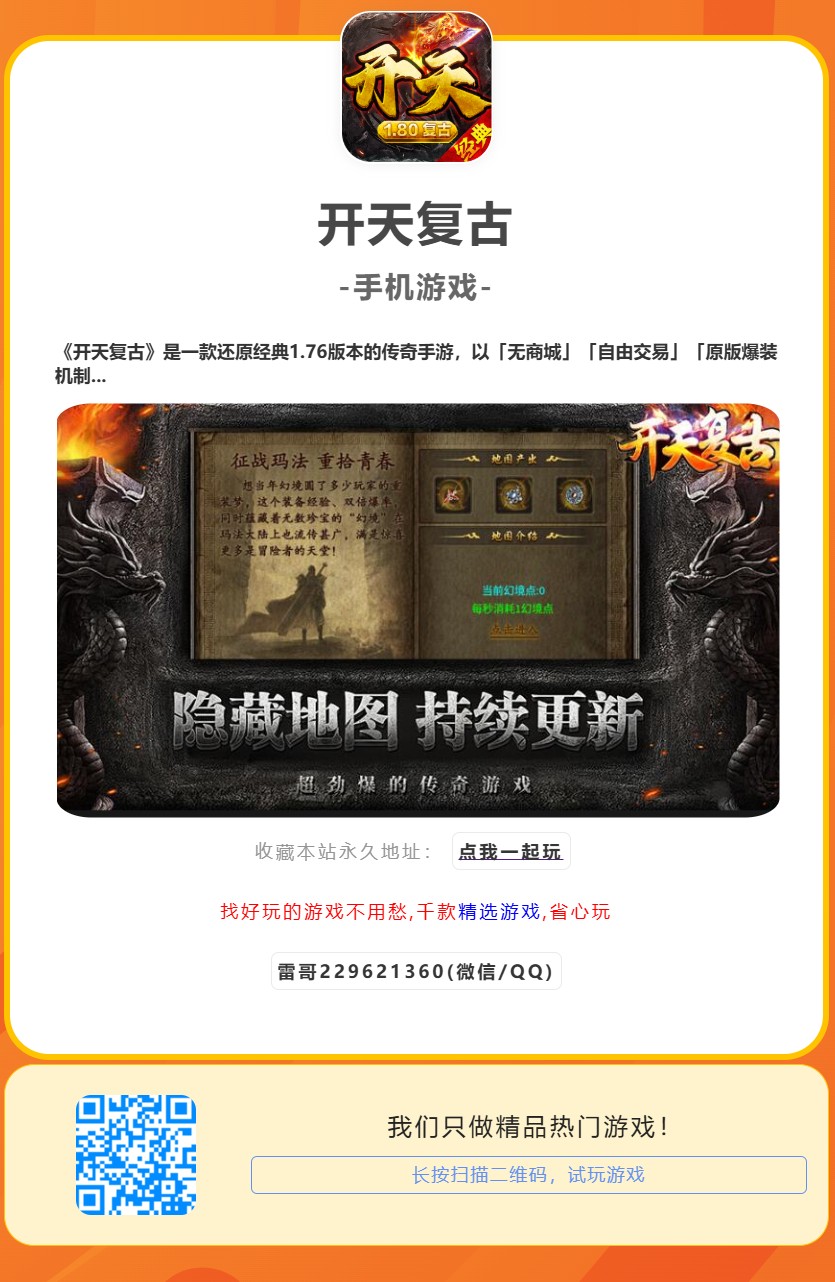 《开天复古》是一款还原经典1.76版本的传奇手游,以「无商城」「自由交易」「原版爆装机制」为核心特色。本文详解职业强度梯度、装备爆率地图、攻沙战术技巧,助你从新手快速成长为沙城霸主。