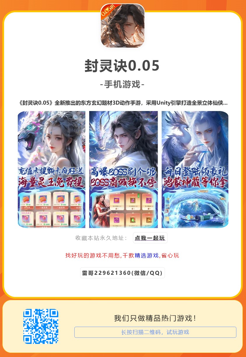 《封灵诀0.05》全新推出的东方玄幻题材3D动作手游,采用Unity引擎打造全景立体仙侠世界。游戏以"灵魄觉醒"为核心设定,玩家将扮演上古修士后裔,通过收集百种灵魄、修炼上古秘术,在九重天域展开冒险征程。最新0.05版本新增"天机秘境"副本和"五行灵阵"系统,优化了战斗连招机制与角色成长曲线。