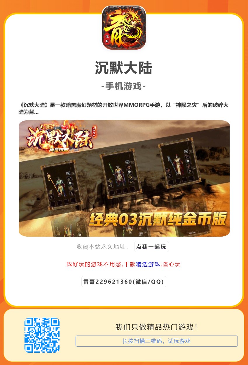 《沉默大陆》是一款暗黑魔幻题材的开放世界MMORPG手游,以“神陨之灾”后的破碎大陆为背景,玩家将扮演觉醒者,探索被诅咒的遗迹、深渊地牢与失落神庙。游戏采用无缝大地图设计,结合自由职业搭配、动态天气系统和多结局剧情分支,打造高自由度沉浸式体验。黑暗美学画风、硬核战斗机制(如体力闪避、弱点破防)以及昼夜交替触发的特殊事件,为玩家呈现充满策略深度的冒险世界。