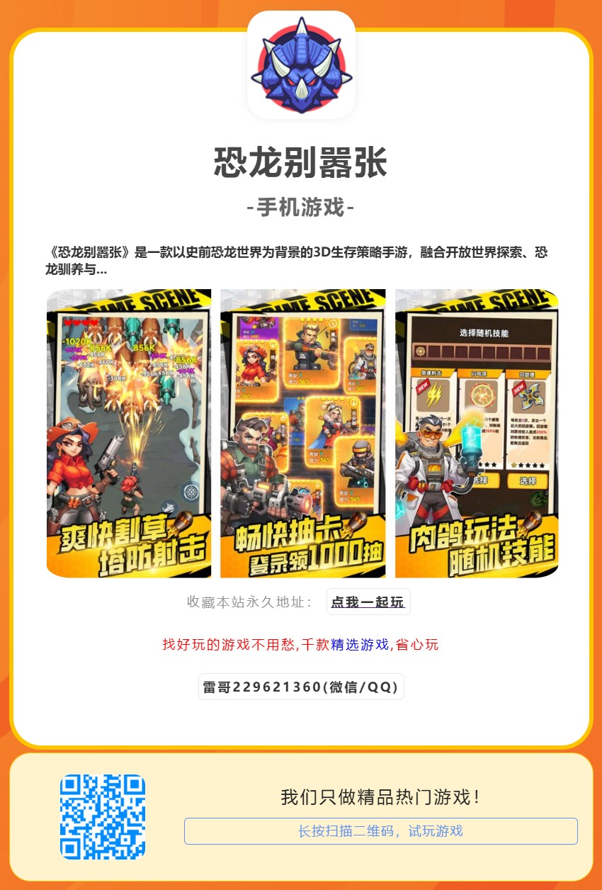 《恐龙别嚣张》是一款以史前恐龙世界为背景的3D生存策略手游,融合开放世界探索、恐龙驯养与部落战争玩法。玩家将化身原始部落首领,在危机四伏的侏罗纪大陆上采集资源、驯服霸王龙、三角龙等史前巨兽,并与其他玩家结盟或对抗,争夺领地与稀有物资。游戏采用高自由度建造系统、动态天气灾害(如火山喷发、陨石雨)以及真实恐龙生态链设定,为玩家提供沉浸式的生存挑战与策略博弈体验。