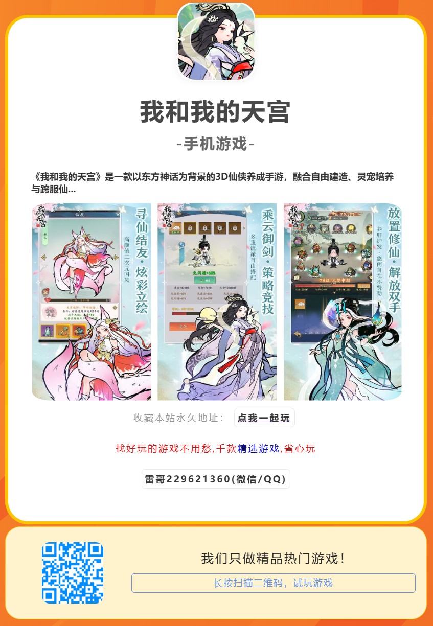 《我和我的天宫》是一款以东方神话为背景的3D仙侠养成手游,融合自由建造、灵宠培养与跨服仙域争霸玩法。玩家将扮演飞升修士,在云端天宫中打造专属洞府,驯养青龙、朱雀等上古神兽,并与各路仙友结盟,探索九重天秘境、挑战上古魔神。游戏采用国风水墨美术风格,结合动态四季变换、自由飞行系统及实时天气交互(如雷劫渡厄、灵雨灌溉),打造高自由度的沉浸式修仙世界。
