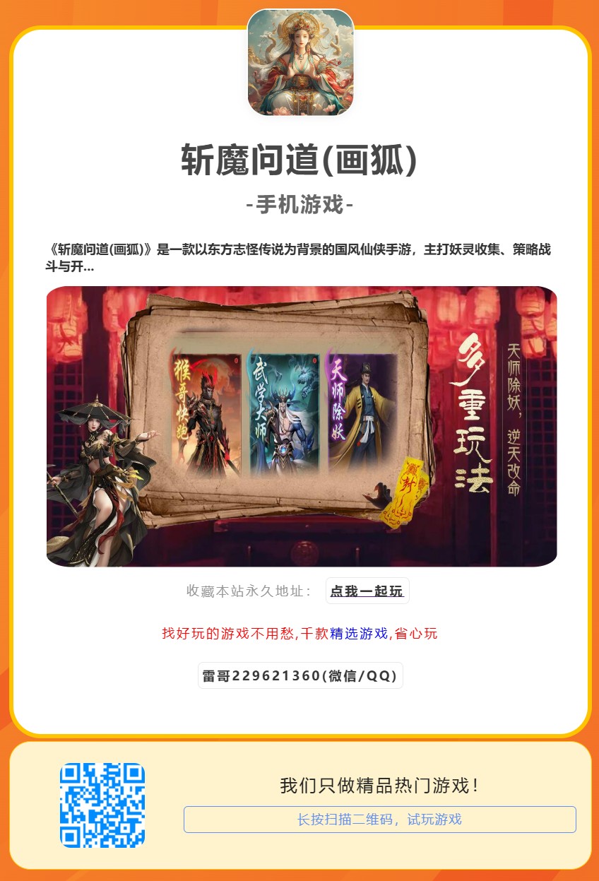 《斩魔问道(画狐)》是一款以东方志怪传说为背景的国风仙侠手游,主打妖灵收集、策略战斗与开放世界探索。玩家将扮演“画狐师”,穿梭于人妖两界,收服九尾狐、山魈等上古妖灵,破解悬疑诡案,并参与宗门论剑与跨服妖域争夺战。游戏采用水墨渲染技术,融合动态昼夜奇遇、妖灵羁绊系统及自由捏脸换装玩法,打造沉浸式国风降妖之旅。