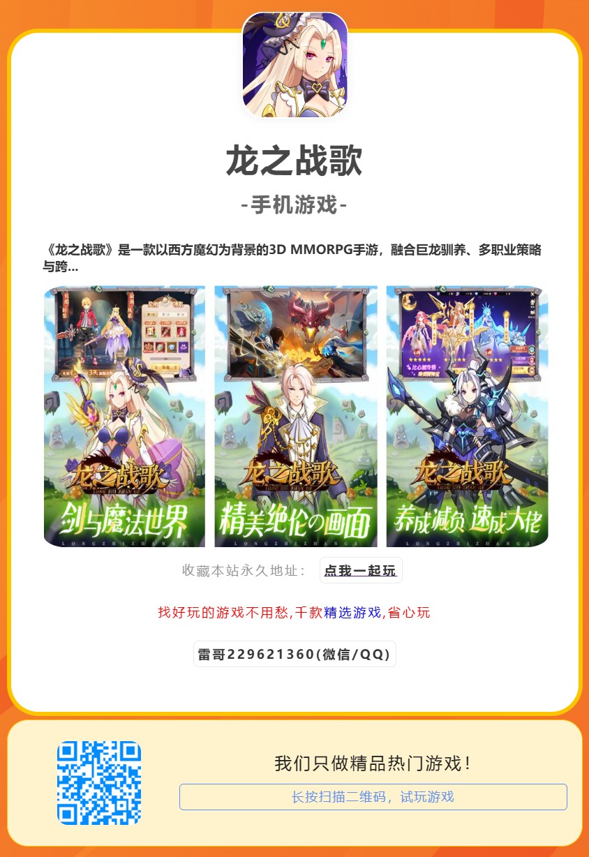 《龙之战歌》是一款以西方魔幻为背景的3D MMORPG手游,融合巨龙驯养、多职业策略与跨服领土争夺玩法。玩家将扮演龙裔战士,在艾泽拉斯大陆驯服传奇巨龙、打造神装,参与史诗级副本挑战与万人跨服战场。游戏采用写实魔幻画风,结合自由飞行战斗、动态天气交互及巨龙血脉觉醒系统,打造高沉浸感的龙与魔法世界。