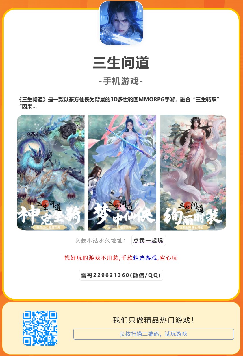 《三生问道》是一款以东方仙侠为背景的3D多世轮回MMORPG手游,融合“三生转职”“因果轮回”与开放世界探索玩法。玩家将经历人、仙、魔三界轮回,修习不同功法,驯养上古神兽,破解天地大劫。游戏采用动态因果剧情系统,结合昼夜四季变换、渡劫飞升与自由捏脸换装,打造沉浸式仙侠史诗。