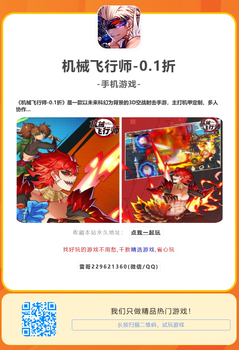 《机械飞行师-0.1折》是一款以未来科幻为背景的3D空战射击手游,主打机甲定制、多人协作与实时竞技。游戏设定在星际战争时代,玩家将扮演机械飞行师,操控专属机甲参与资源争夺、星系远征等玩法,体验高速空战与策略对抗。其核心特色为“0.1折超低充值折扣”,通过超值礼包与返利活动大幅降低养成门槛,吸引机甲爱好者与性价比玩家。