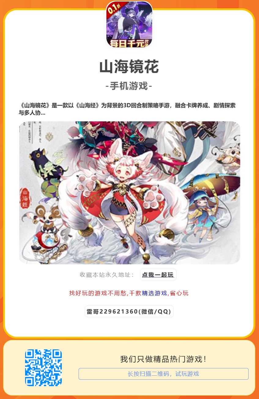 《山海镜花》是一款以《山海经》为背景的3D回合制策略手游,融合卡牌养成、剧情探索与多人协作玩法。游戏以“镜花水月”为核心设定,玩家将扮演“镜灵使者”,穿梭于上古神话与幻境之间,收集百种镜灵、组建阵容,挑战异兽BOSS与跨服副本。其独特的美术风格、沉浸式剧情与策略战斗系统,吸引大量二次元与国风爱好者。