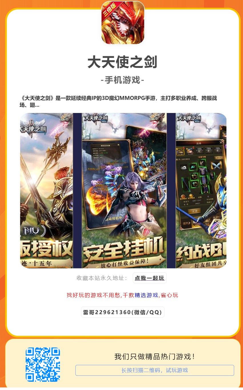 《大天使之剑》是一款延续经典IP的3D魔幻MMORPG手游,主打多职业养成、跨服战场、翅膀系统等高人气玩法。游戏还原端游经典设定,玩家可选择剑士、法师、弓箭手三大职业,挑战血色城堡、恶魔广场等经典副本,体验装备爆装、自由交易的怀旧情怀。其特色“0.1折超值充值”与“全民高爆率”机制,大幅降低战力养成门槛,吸引情怀玩家与新晋冒险者。