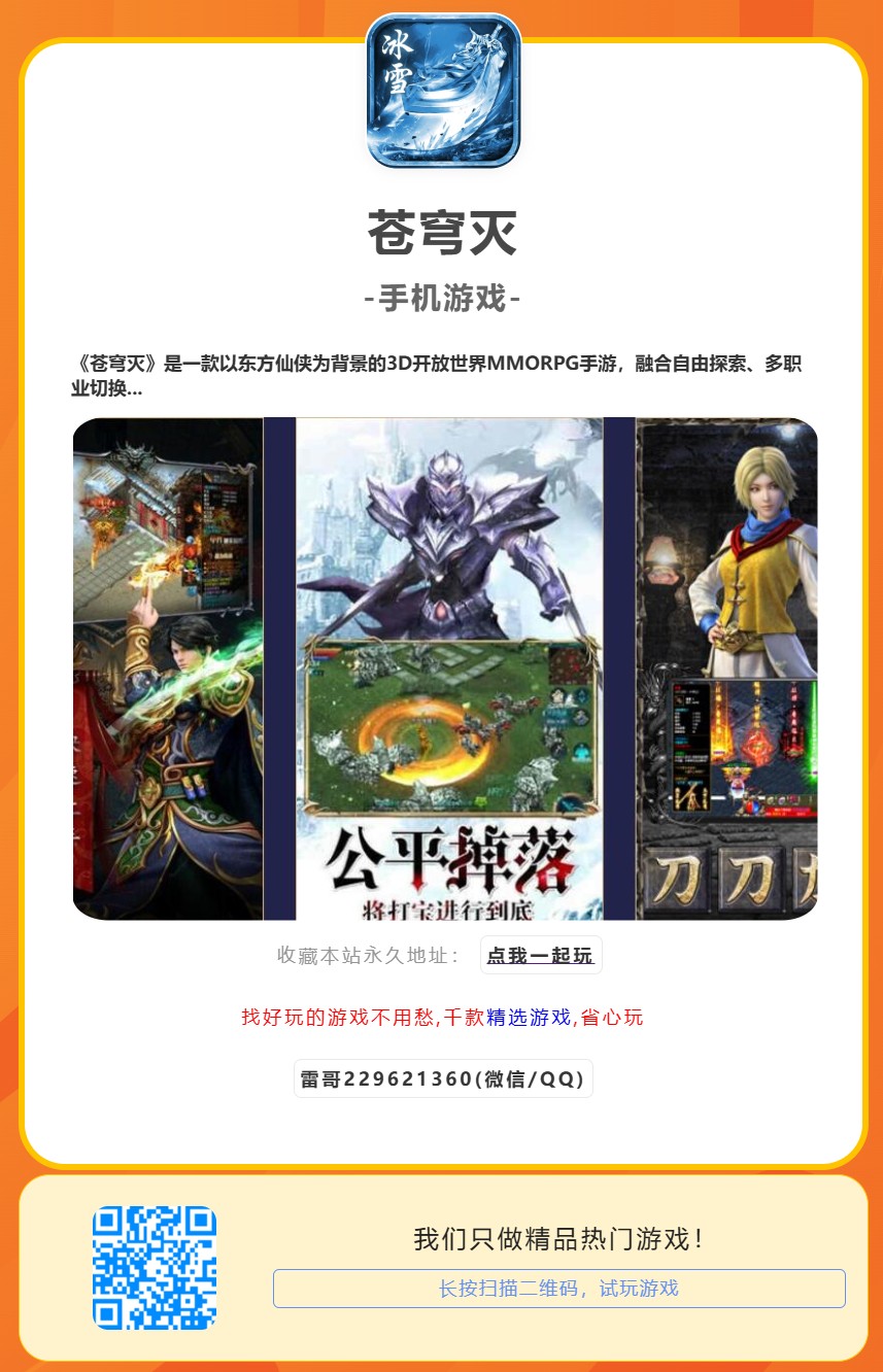 《苍穹灭》是一款以东方仙侠为背景的3D开放世界MMORPG手游,融合自由探索、多职业切换、跨服仙盟战等核心玩法。游戏以“破碎虚空”为世界观,玩家可化身修真者,御剑飞行、驯服灵兽、挑战上古神魔,体验从凡人到仙尊的逆天改命之旅。其特色“0.1折超值充值”与“天域神兵”高爆率系统,大幅降低装备养成门槛,吸引喜爱高自由度与策略对抗的仙侠玩家。