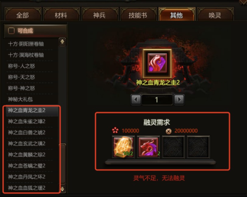 4. 神之血开放合成到2级, 消耗条件:灵气100000,铜币2000000,2个相同神之血加2个万灵玉,