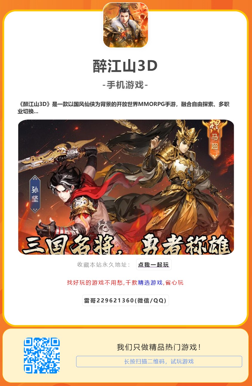 《醉江山3D》是一款以国风仙侠为背景的开放世界MMORPG手游,融合自由探索、多职业切换、跨服国战等核心玩法。游戏以“乱世争霸”为世界观,玩家可扮演侠客、谋士、武将等角色,参与阵营对抗、驯服神兽、争夺皇城,体验从江湖小卒到一方霸主的成长历程。其特色“0.1折超值充值”与“神装高爆率”系统,大幅降低养成门槛,吸引喜爱策略对抗与自由交易的国风玩家。