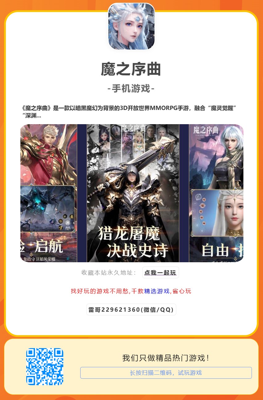 《魔之序曲》是一款以暗黑魔幻为背景的3D开放世界MMORPG手游,融合“魔灵觉醒”“深渊远征”“跨服魔域战”等核心玩法。游戏以“魔神复苏”为世界观,玩家可化身契约者,召唤上古魔灵,探索深渊秘境、争夺魔域领土,体验策略对抗与高爆率打金的硬核玩法。其特色“0.1折超值充值”与“魔灵高爆率”系统,大幅降低养成门槛,吸引暗黑风格与自由交易玩家。