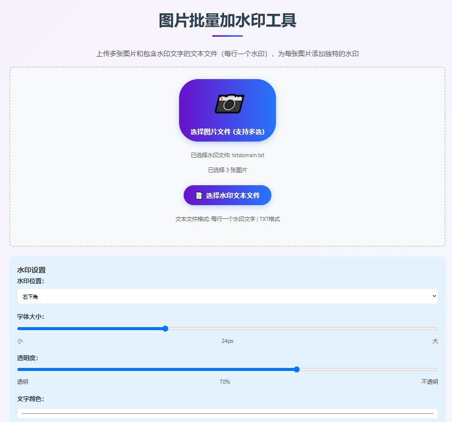 - 上传水印文本:点击"选择水印文本文件"上传包含水印文字的TXT文件(每行一个水印)
