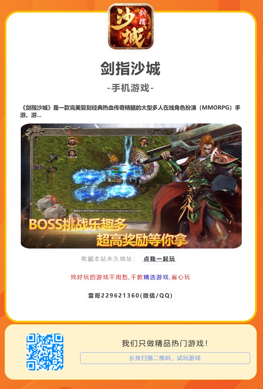 《剑指沙城》是一款完美复刻经典热血传奇精髓的大型多人在线角色扮演(MMORPG)手游。游戏重现原汁原味的玛法大陆,玩家可自由选择战、法、道三大经典职业,体验万人同屏攻城、自由PK爆装、打宝交易的纯粹传奇激情。游戏在保留复古画面与核心玩法的基础上,针对移动端进行了操作优化与内容升级,带来更流畅的PK手感、更丰富的副本挑战与更便捷的社交体系,是传奇老玩家重温情怀与新玩家体验经典的绝佳选择。