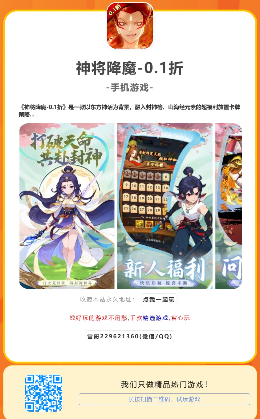 《神将降魔-0.1折》是一款以东方神话为背景,融入封神榜、山海经元素的超福利放置卡牌策略手游。玩家将扮演三界守护者,收集名震三界的神魔仙将(姜子牙、哪吒、孙悟空、妲己等),组建强力阵容,一路斩妖除魔,平定三界动乱。