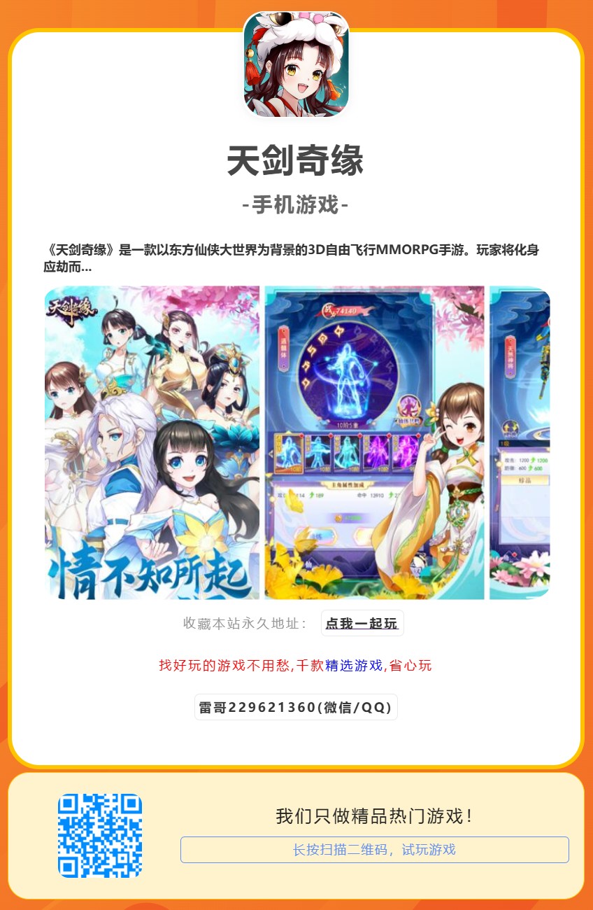 2、《天剑奇缘》是一款放置类修仙手游,野外刷怪全程挂机无需操作。华丽的3D人物建模,炫酷的神兵灵翼,可爱蠢萌的灵兽,霸气威武的坐骑,还有新颖独特的机关术灵臂和变身玩法。多种有趣的社交玩法,与众仙家举行仙缘结拜闯荡修仙世界,召集高手组建战队横扫战场,号令兄弟们创建仙盟制霸全服。天剑奇缘期待少侠共游八荒。