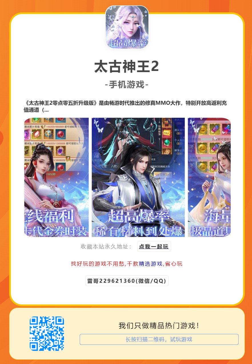 《太古神王2零点零五折升级版》是由畅游时代推出的修真MMO大作,特别开放高返利充值通道(消费100元实际抵扣0.05元)。玩家可体验百人跨服神域争夺、万件神装自由交易。本攻略详解版本特权机制、快速冲级路线及微氪阵容养成策略。