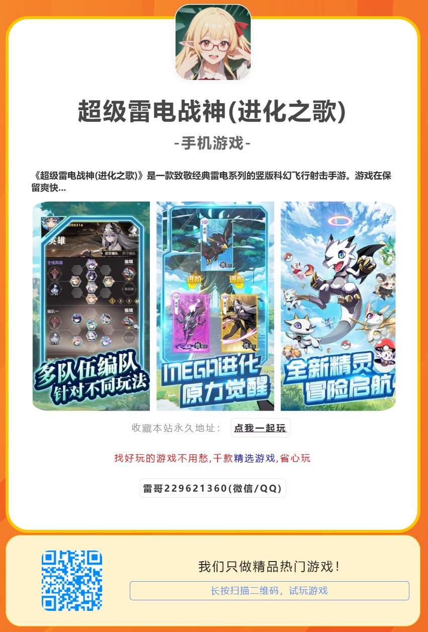 《超级雷电战神(进化之歌)》是一款致敬经典雷电系列的竖版科幻飞行射击手游。游戏在保留爽快弹幕躲避与暴走火力核心玩法的同时,创新加入“进化升级”体系与战机自由组装模块。玩家将驾驶可动态进化的超级战机,穿梭于未来星际战场,对抗外星机械军团,体验每秒千发弹幕的视觉盛宴与操作极限。