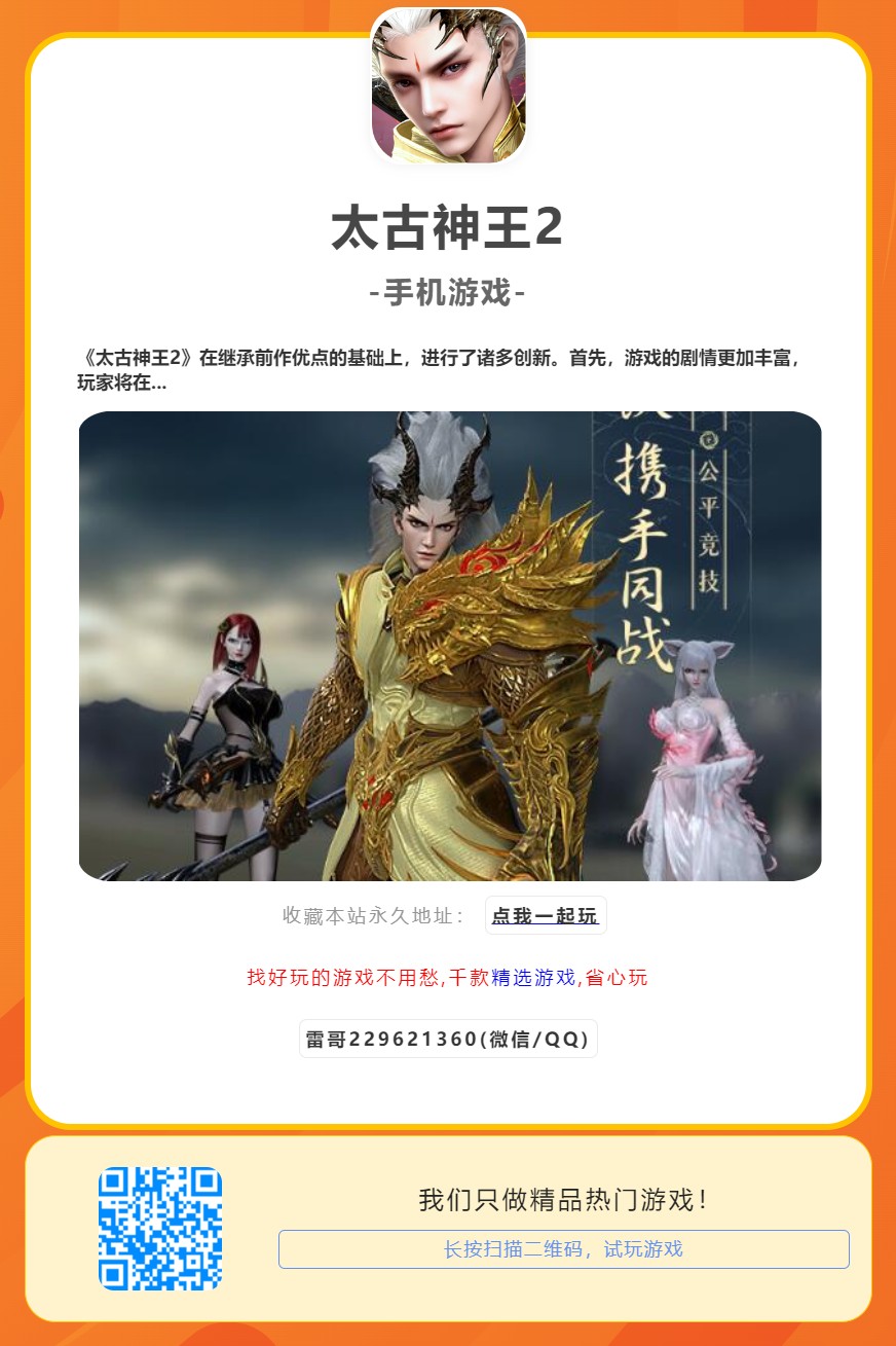 《太古神王2》在继承前作优点的基础上,进行了诸多创新。首先,游戏的剧情更加丰富,玩家将在冒险中逐步揭开太古世界的神秘面纱,探寻那些隐藏在历史长河中的秘密。其次,游戏在角色设定和战斗系统方面也进行了优化,每个角色都有独特的技能和成长线,战斗更加流畅、刺激。