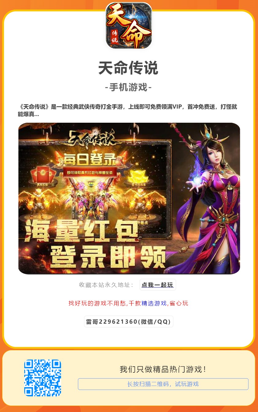 《天命传说》是一款经典武侠传奇打金手游,上线即可免费领满VIP,首冲免费送,打怪就能爆真充,不肝不氪,散人也能玩转传奇。